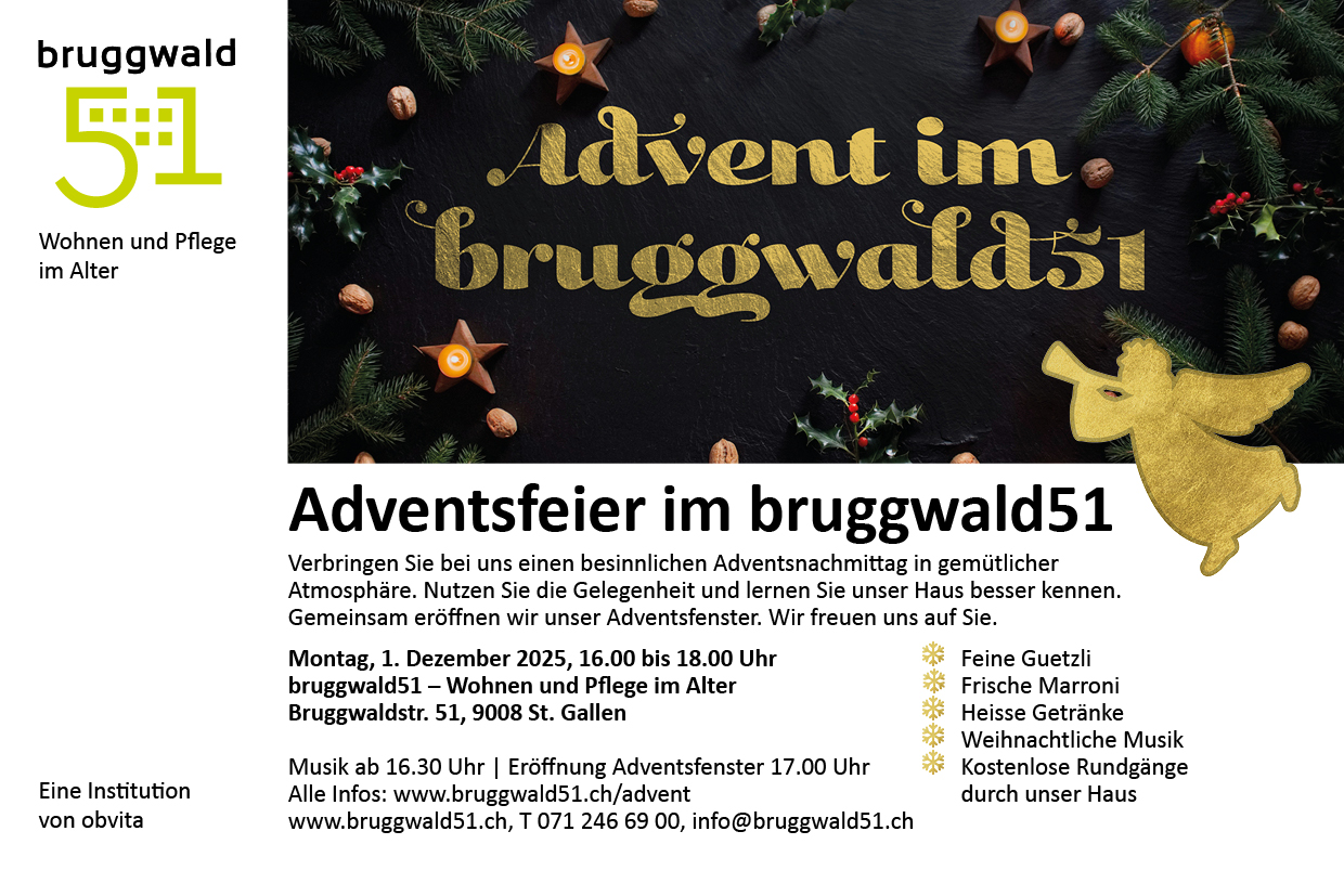 Begrüssen wir gemeinsam die Weihnachtszeit: Am Montag, 1. Dezember, lädt bruggwald51 – Wohnen und Pflege im Alter ein zum gemütlichen Adventsfest. Von 16.00 bis 18.00 Uhr erwartet Sie ein besinnlicher Nachmittag mit feinen Guetzli, frischen Marroni, heissen Getränken und weihnachtlicher Musik von einem Blasmusik-Trio. Um 17 Uhr wird das erste Fenster der Adventslaterne geöffnet, die von den Bewohnenden des bruggwald51 gestaltet wurde.